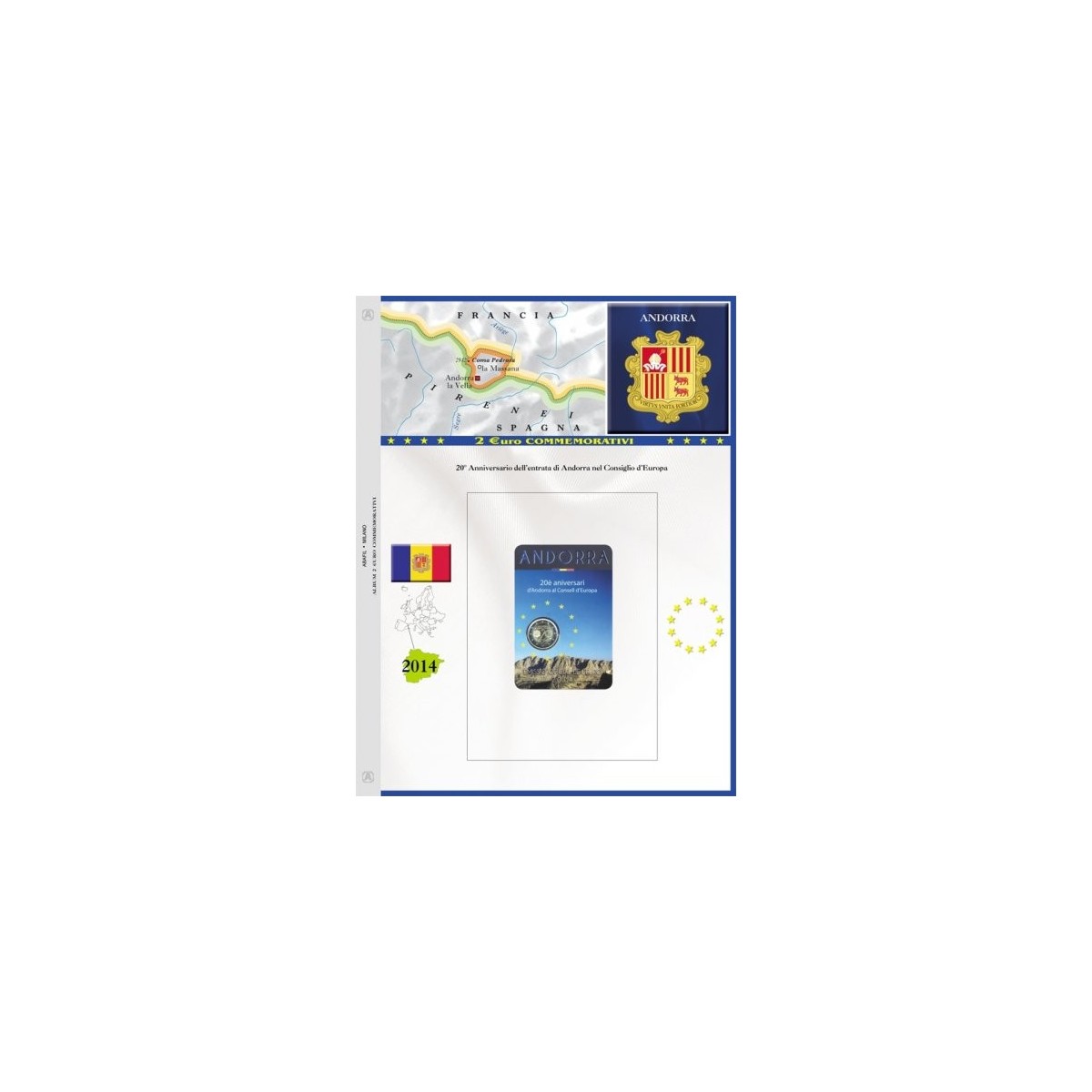 Foglio di aggiornamento per i 2€ commemorativi di Andorra emesso nel 2014 in Blister.