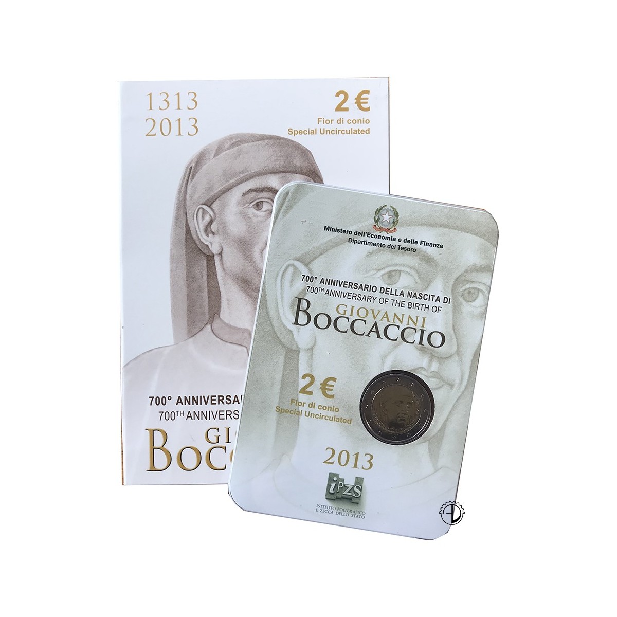 Nel disegno è raffigurato il volto di Giovanni BOCCACCIO, di tre quarti, rivolto verso destra, tratto dall'affresco di Andrea del Castagno, 1450 ca. (Firenze, Galleria degli Uffizi); in basso,in circolo, la scritta «BOCCACCIO 1313 2013»; a destra le lettere «R» (monogramma della Zecca di Roma), «RI» (monogramma della Repubblica Italiana) e «m» (sigla dell'autore Roberto Mauri).