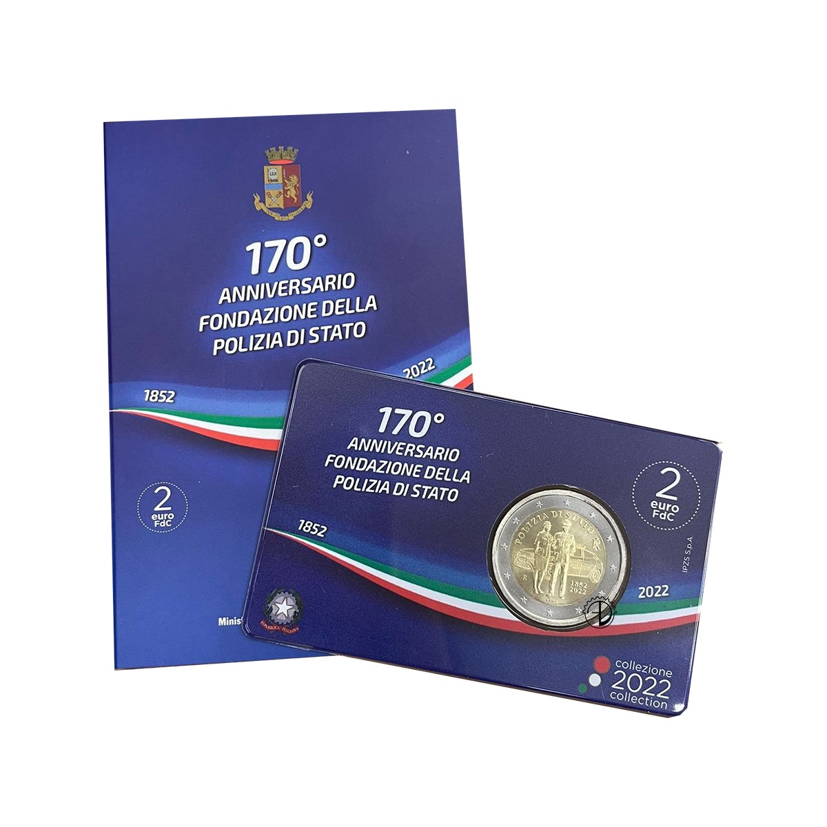 Due agenti della Polizia di Stato, un uomo e una donna, si stagliano in primo piano davanti ad un’auto della Polizia. In alto, ad arco, la scritta “POLIZIA DI STATO”; a destra, “RI”, acronimo della Repubblica Italiana; in basso, rispettivamente a sinistra, al centro e a destra, “R”, identificativo della Zecca di Roma, “AM”, sigla dell’autore Annalisa Masini e le date “1852 2022”, anno di fondazione della Polizia di Stato e anno di emissione della moneta
