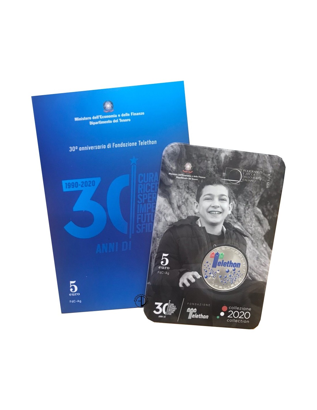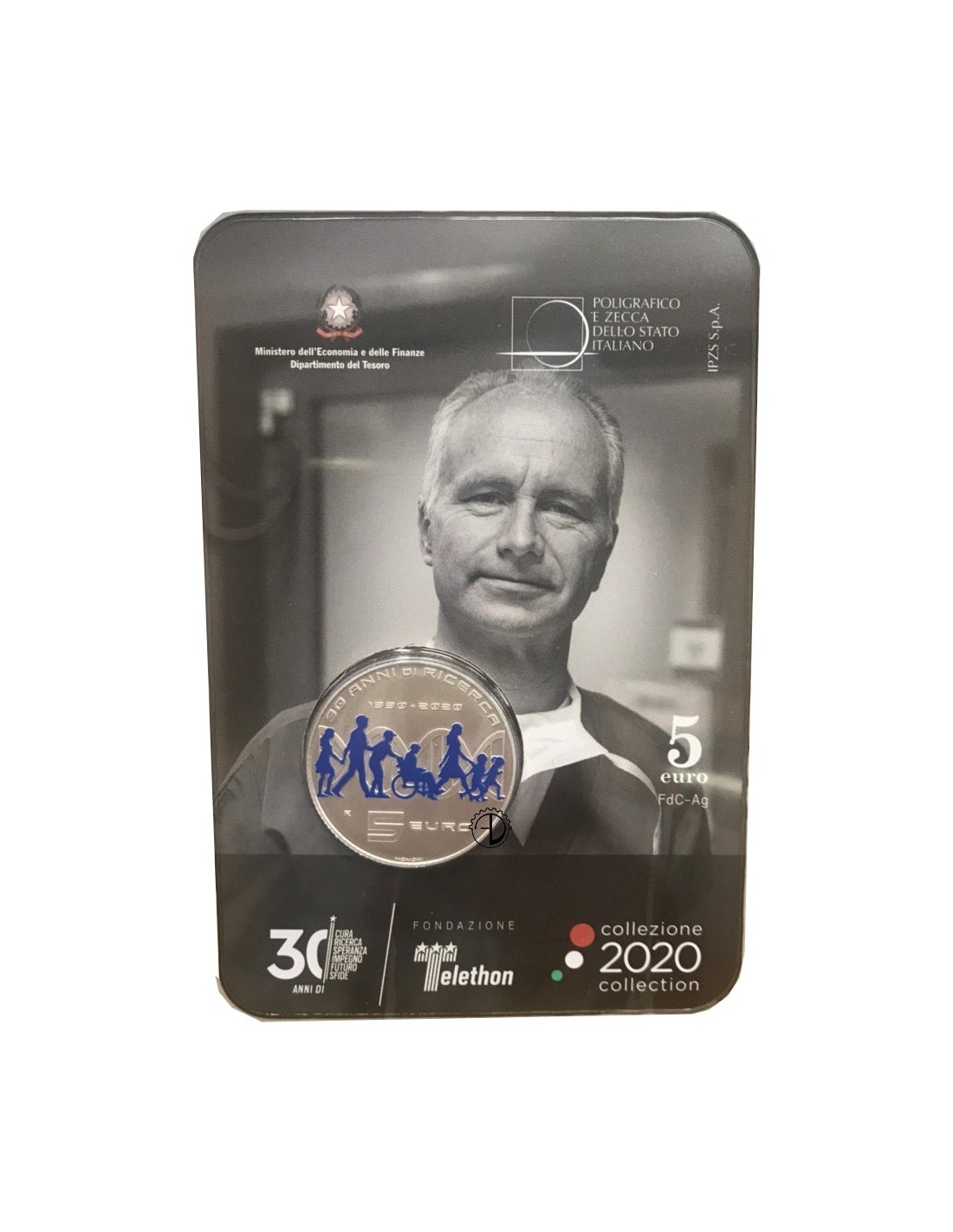 Rovescio: Sullo sfondo doppia elica del DNA stilizzata, sulla quale sono sovrapposte sagome di figure umane unite in una catena di solidarietà. In alto, nel giro, la scritta “30 ANNI DI RICERCA”; a seguire, le date “1990*2020”; in basso, a sinistra, “R” identificativo della Zecca di Roma; al centro, il valore “5 EURO”; in basso, il nome dell’autore “MOMONI”. Moneta con elemento colorati.