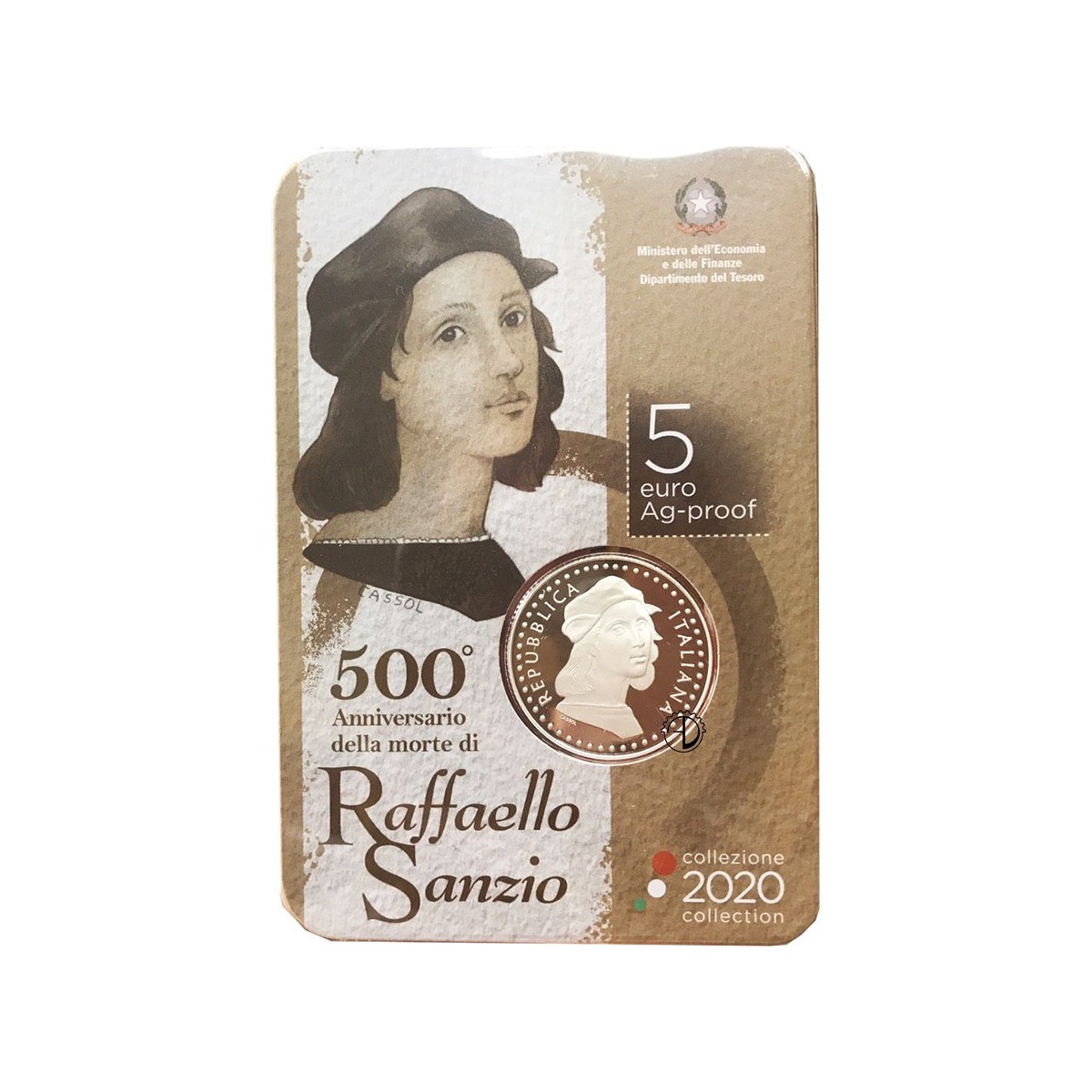 Rovescio: Particolare dell’affresco di Raffaello Sanzio “Scuola di Atene”, realizzato tra il 1509 e il 1511 (Stanza della Segnatura, Musei Vaticani, Città del Vaticano). In alto, la scritta “RAFFAELLO” delimitata da un semiarco di globetti che richiama la volta contenente l’affresco; nel campo, le date “1520”, al centro, e “2020”, a destra; in basso, il valore “5 EURO”; sul lato sinistro, “R”, identificativo della Zecca di Roma.