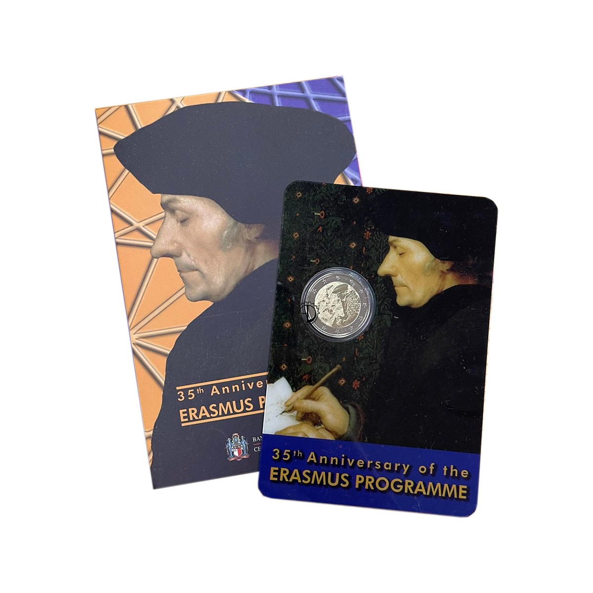 Il disegno unisce due elementi principali del programma Erasmus: l’ispirazione intellettuale all’origine del programma, Erasmo stesso, e l’allegoria della sua influenza in Europa. Il primo elemento è simboleggiato da una delle raffigurazioni più note di Erasmo da Rotterdam. Il secondo è simboleggiato da una rete luminosa di collegamenti che attraversano la moneta da un punto all’altro, rappresentando in tal modo i numerosi scambi intellettuali e umani tra gli studenti europei. In riferimento all’Europa, alcuni di questi collegamenti formano altre stelle, nate dalla sinergia tra i paesi. Dalle stelle emerge, in grafica contemporanea, il numero 35 in omaggio al 35º anniversario del programma. Sull’anello esterno figurano le dodici stelle della bandiera dell’Unione europea.