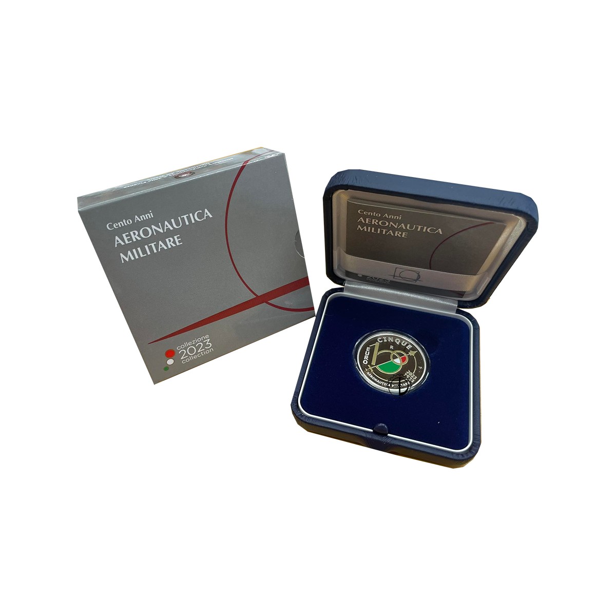 Raffigurazione del logo del Centenario dell’Aeronautica Militare “1923-2023”, rispettivamente, anno della sua costituzione e anno di emissione della moneta. Nel campo di sinistra, la scritta “EURO”; in alto, “CINQUE”; a seguire, “R”, identificativo della Zecca di Roma; a destra “VdS”, sigla dell’autore Valerio De Seta; in esergo, ad arco, la scritta “AERONAUTICA MILITARE”. Moneta con elementi colorati.