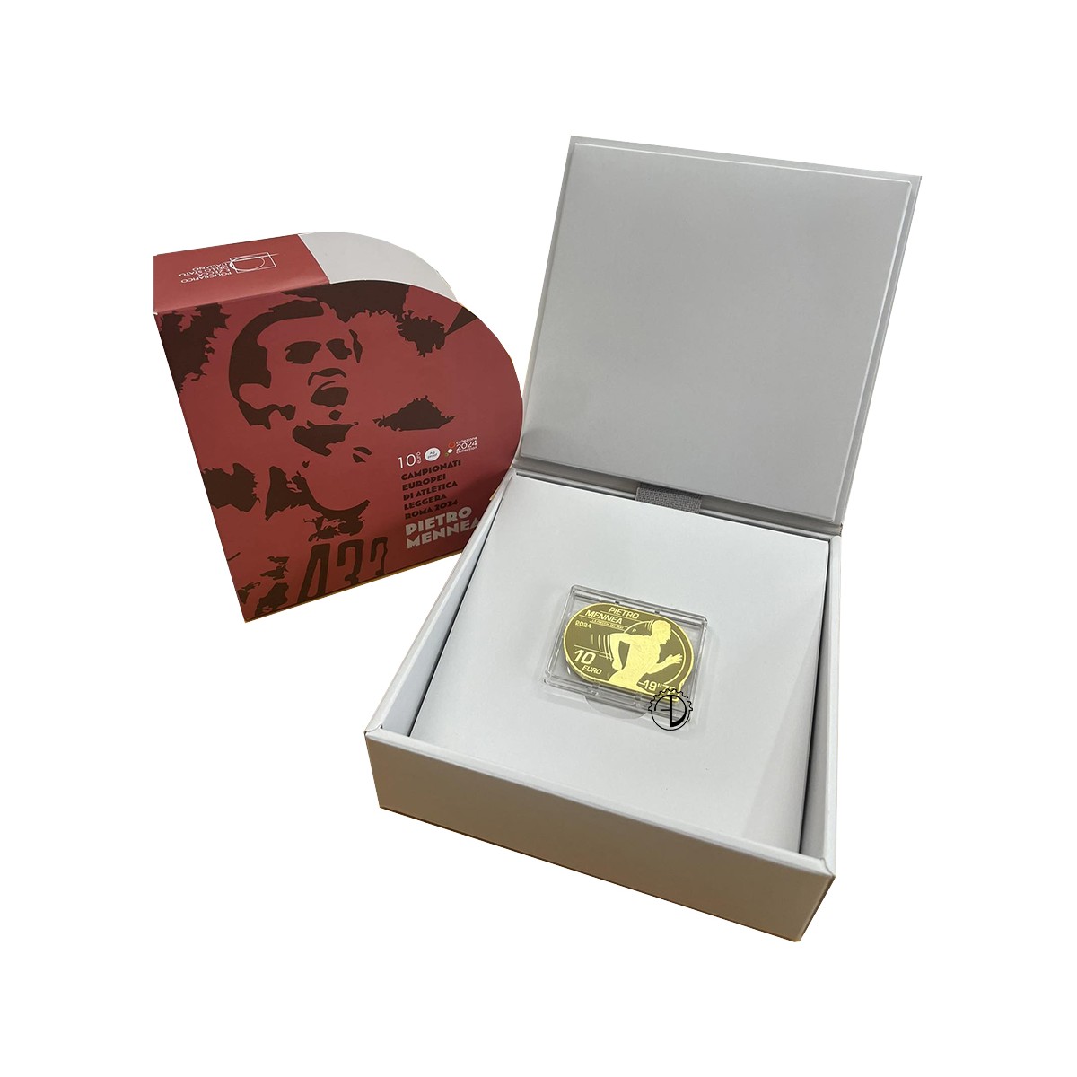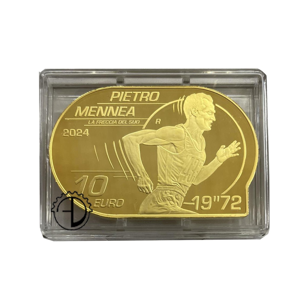 Rovescio: Pietro Mennea, leggendario velocista italiano, è raffigurato con la pettorina numero “433”, che indossava quando vinse la medaglia d’oro ai Giochi della XXII Olimpiade, e il pantaloncino con il numero “8”, a indicare la corsia in cui raggiunse il podio più alto ai Giochi olimpici che si svolsero a Mosca nel 1980. In basso, a destra, “19’’72” a rappresentare il record del mondo dei 200 metri stabilito da Pietro Mennea a Città del Messico nel 1979. In basso, a sinistra, il valore “10 EURO”; in altro, a sinistra, “PIETRO MENNEA”, “LA FRECCIA DEL SUD” e “2024”, anno di emissione della moneta; al centro, “R”, identificativo della Zecca di Roma.