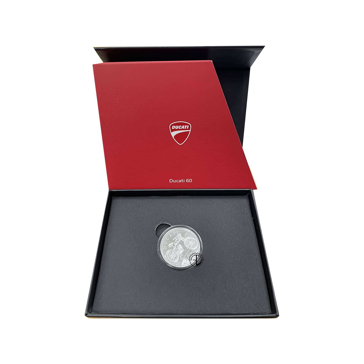 Rovescio: La prima moto realizzata dalla Ducati nel 1949, Cucciolo. A destra, «2024», anno di emissione della moneta; in basso, il valore «5 EURO» e «R», identificativo della Zecca di Roma; a sinistra, «A.Vecchio», firma dell’autore; in alto, ad arco, la scritta «DUCATI». .