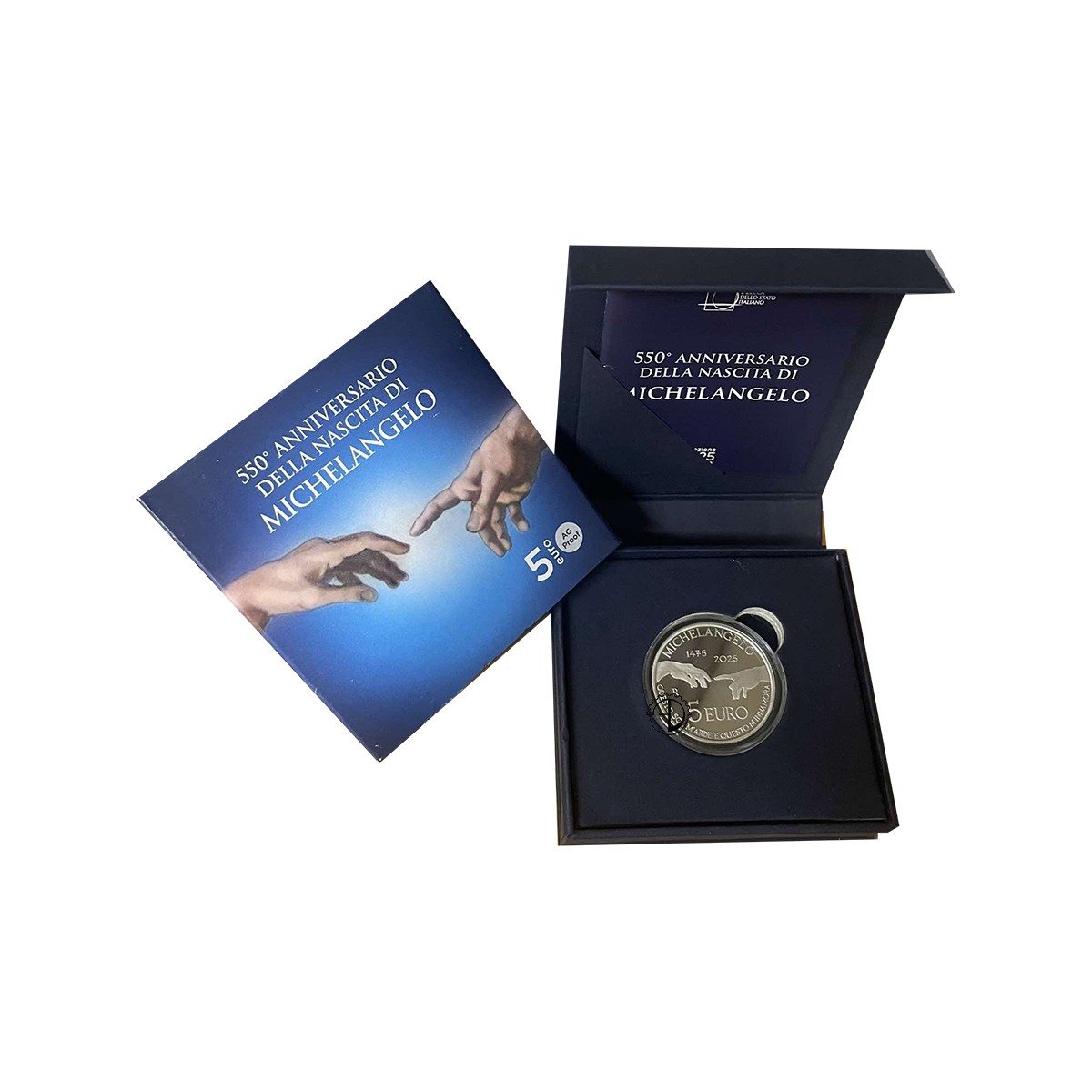 Rovescio: Al centro il particolare delle mani della Creazione di Adamo, affresco situato all’interno della Cappella Sistina. Nel giro, in alto, la scritta “MICHELANGELO” e nel campo le date “1475” e “2025”, rispettivamente, anno di nascita e anno di coniazione della moneta. Nel giro, in basso, la scritta “QUESTO SOL M’ARDE E QUESTO M’INNAMORA”. In basso “5 EURO”, valore nominale. A sinistra “R”, identificativo della Zecca di Roma.