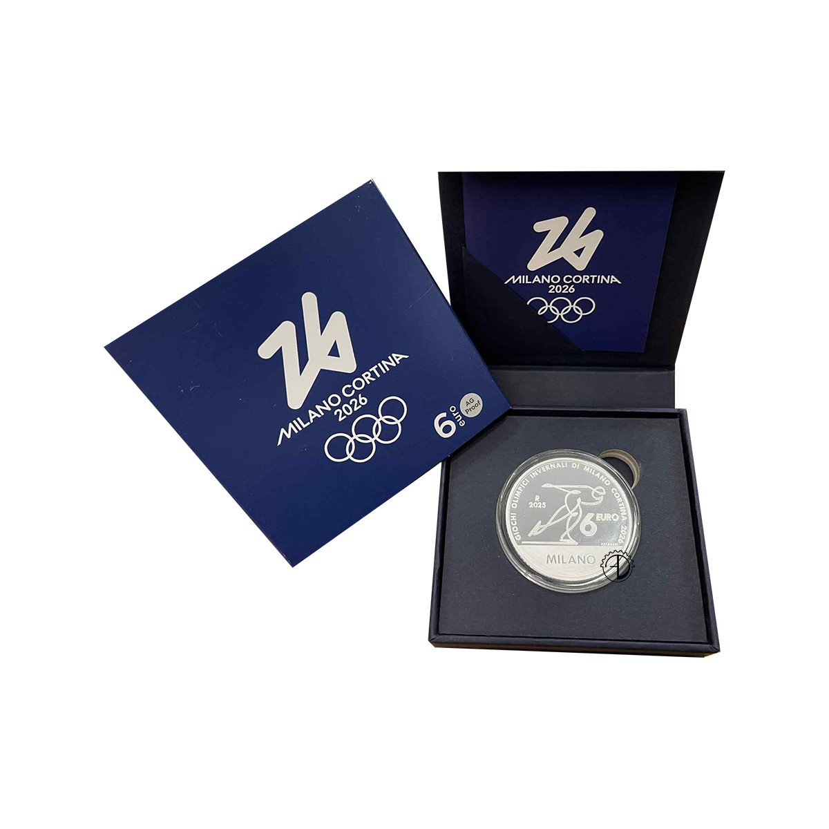Rovescio: Al centro il pittogramma ufficiale della specialità olimpica del pattinaggio di velocità. Nel giro la scritta “GIOCHI OLIMPICI INVERNALI DI MILANO CORTINA 2026”, in basso la scritta “MILANO”, ovvero la città che ospiterà le gare del suddetto sport. Nel campo sulla sinistra “R”, identificativo della Zecca di Roma e “2025”, anno di emissione della moneta; sulla destra “6 EURO”, valore nominale e, in basso, la firma dell’incisore “PETRASSI”.