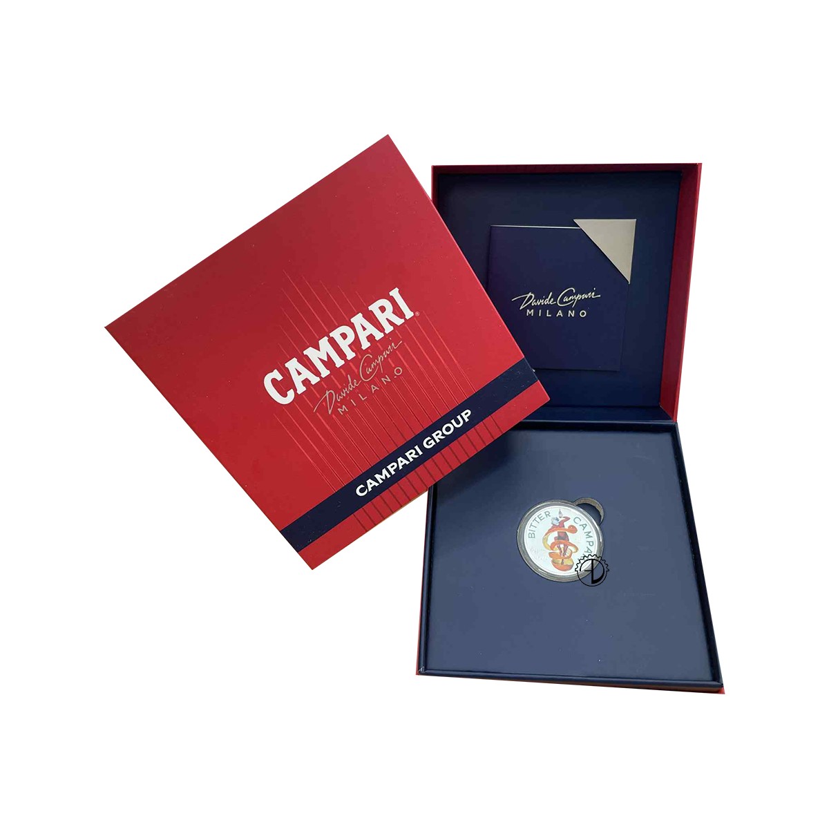 Dritto: Al centro sono riproposte le linee eleganti e minimaliste del cannetté, design che caratterizza le nuove bottiglie. Sovrapposta, la scritta del marchio “CAMPARI” con la firma Davide Campari Milano”. Nel giro, in alto, la scritta “REPUBBLICA ITALIANA”.