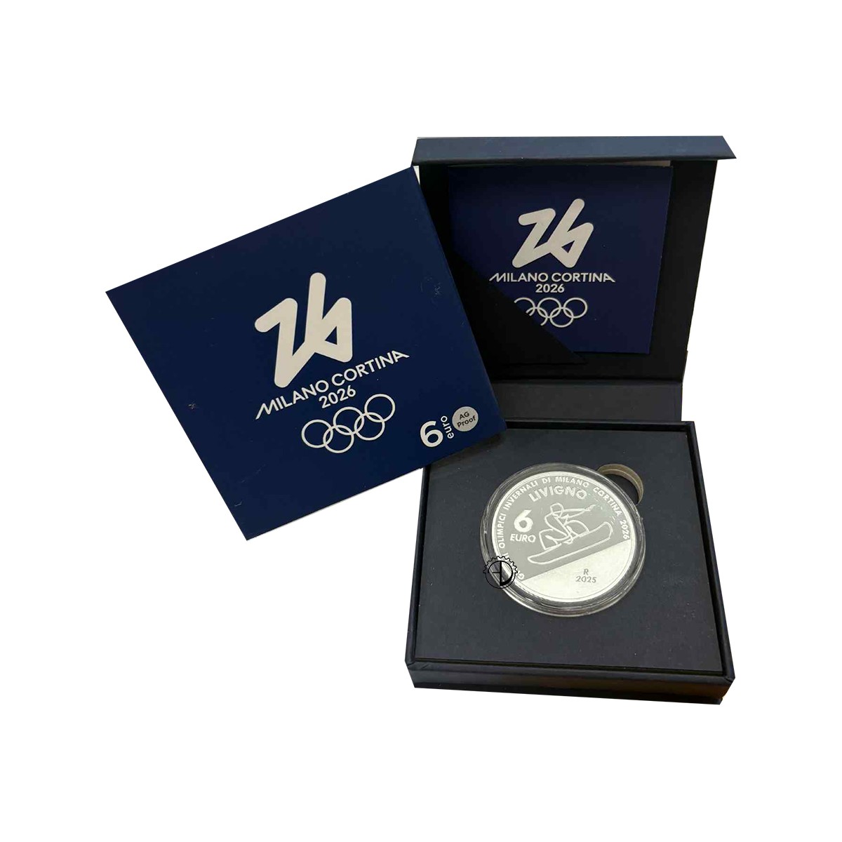 Rovescio: Al centro il pittogramma ufficiale della specialità olimpica snowboard. Nel giro la scritta “GIOCHI OLIMPICI INVERNALI DI MILANO CORTINA 2026”, subito sotto, ad arco, la scritta “LIVIGNO”, ovvero la città che ospiterà le gare del suddetto sport. Sulla sinistra “6 EURO”, valore nominale della moneta. In basso sulla destra “R”, identificativo della Zecca di Roma e “2025”, anno di emissione della moneta; sulla sinistra, in basso, la firma dell’incisore “A.VECCHIO”.