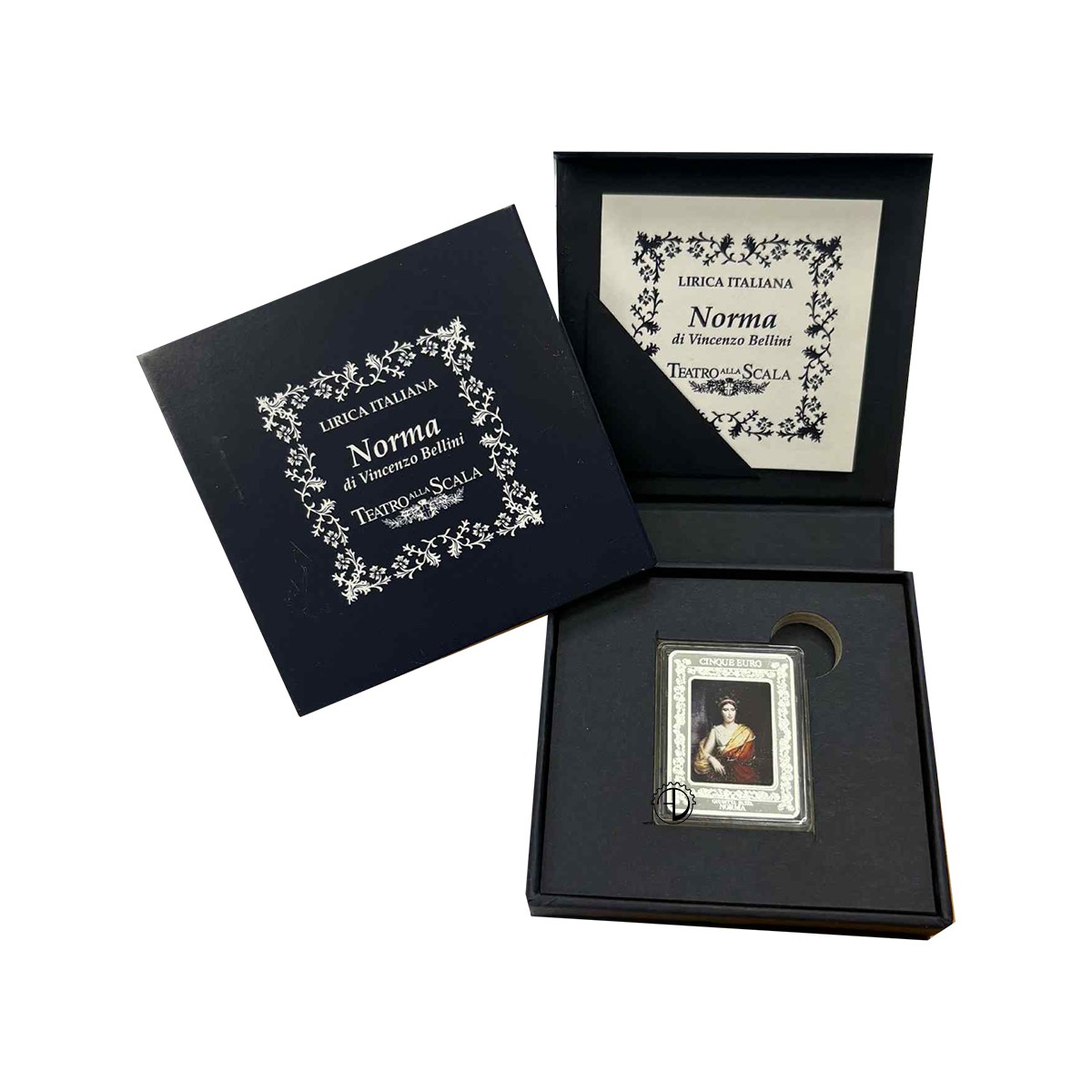 Rovescio: Al centro, all’interno di una cornice di ispirazione ottocentesca, è riprodotto il ritratto di Giuditta Pasta, prima cantante lirica ad interpretare Norma al Teatro alla Scala, ad opera di François Gérard. In alto “CINQUE EURO”, valore nominale; in basso le scritte “GIUDITTA PASTA” e “NORMA”. Moneta con elementi colorati.