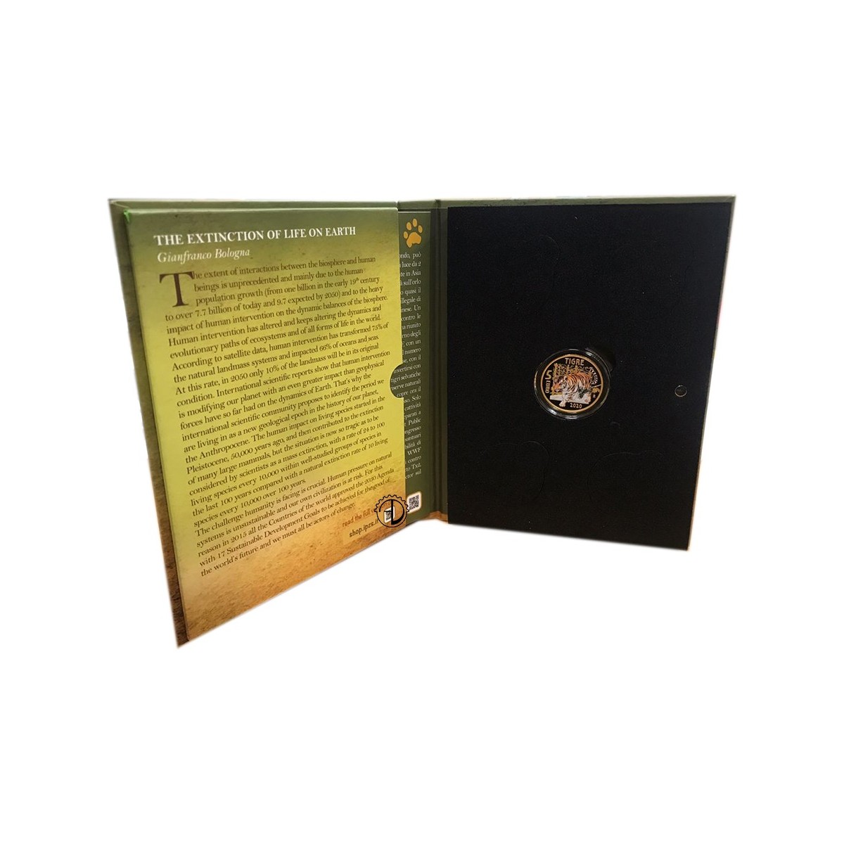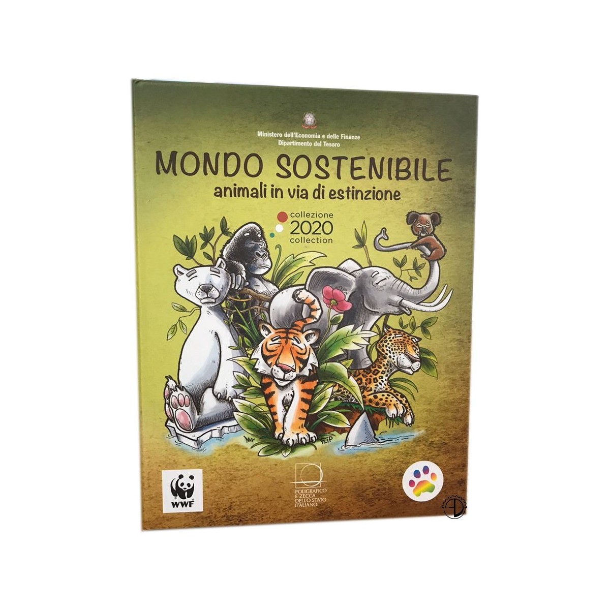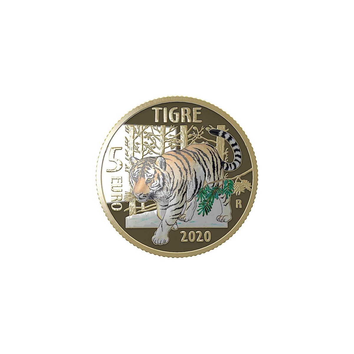 Rovescio: Composizione a colori raffigurante una tigre nel suo ambiente naturale. In alto, la scritta “TIGRE”; a sinistra, il valore “5 EURO”; in basso, l’anno di emissione “2020”; a destra, “R” identificativo della Zecca di Roma. Moneta con elementi colorati.