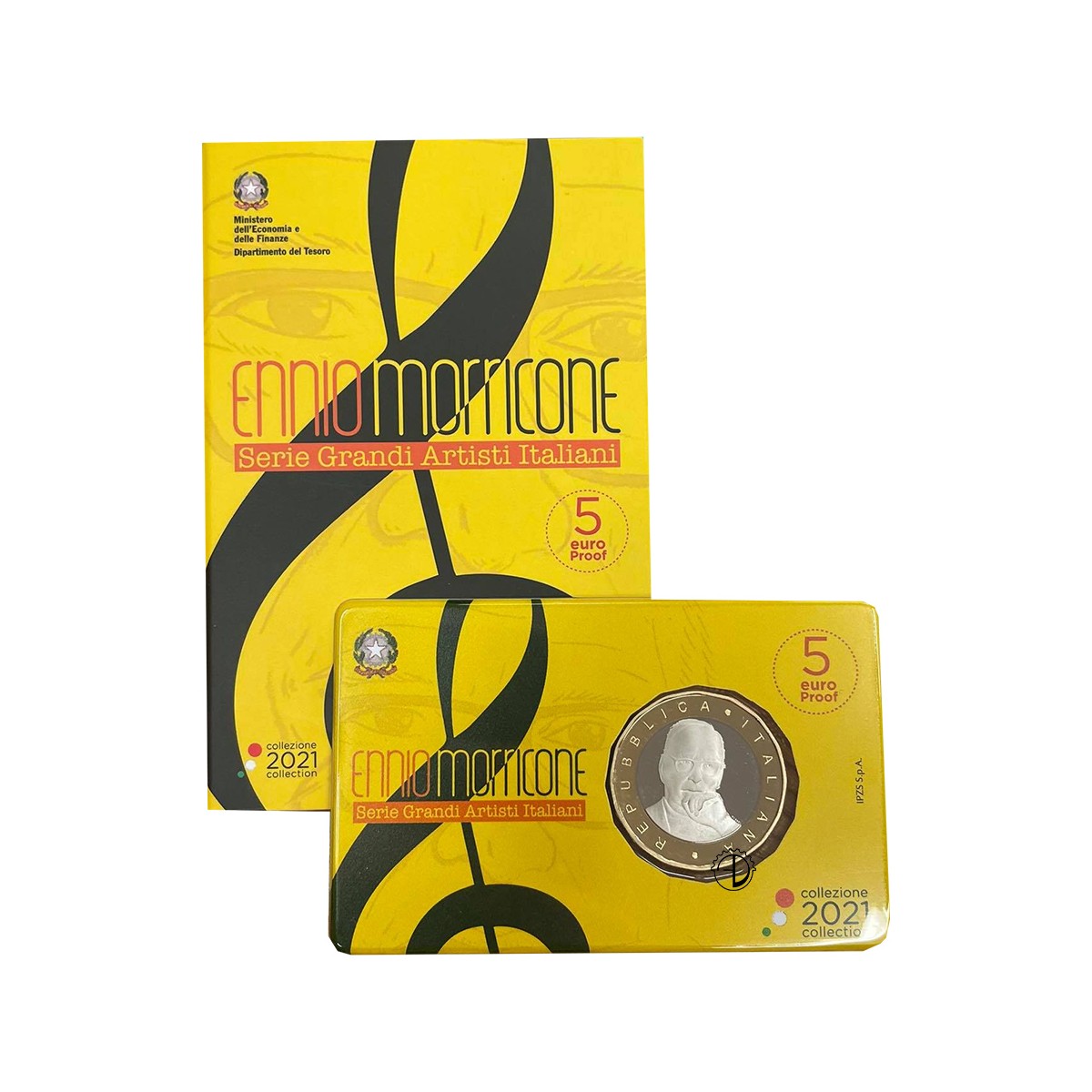 Rovescio: Raffigurazione delle mani del Maestro Ennio Morricone nell’atto di dirigere. Nel giro, la scritta “ENNIO MORRICONE”; in alto, il valore “5 EURO”; nel campo di destra, “R”, identificativo della Zecca di Roma, e l’anno di emissione “2021”.