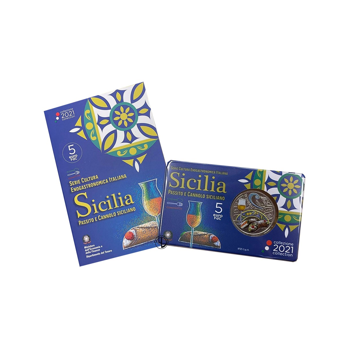 Composizione di elementi rappresentativi della Sicilia: il Tempio della Concordia della Valle dei Templi di Agrigento, il Teatro Antico di Taormina stilizzato, un ramo di mandorlo, un’onda del mare e la Triscele, testa femminile con tre gambe piegate, chiamata anche Trinacria, simbolo della Sicilia e parte integrante della bandiera siciliana. In alto, a giro, la scritta “SAPORI D’ITALIA” e il valore “5 EURO”; a sinistra, “R”, identificativo della Zecca di Roma; in basso, anno di emissione “2021”.