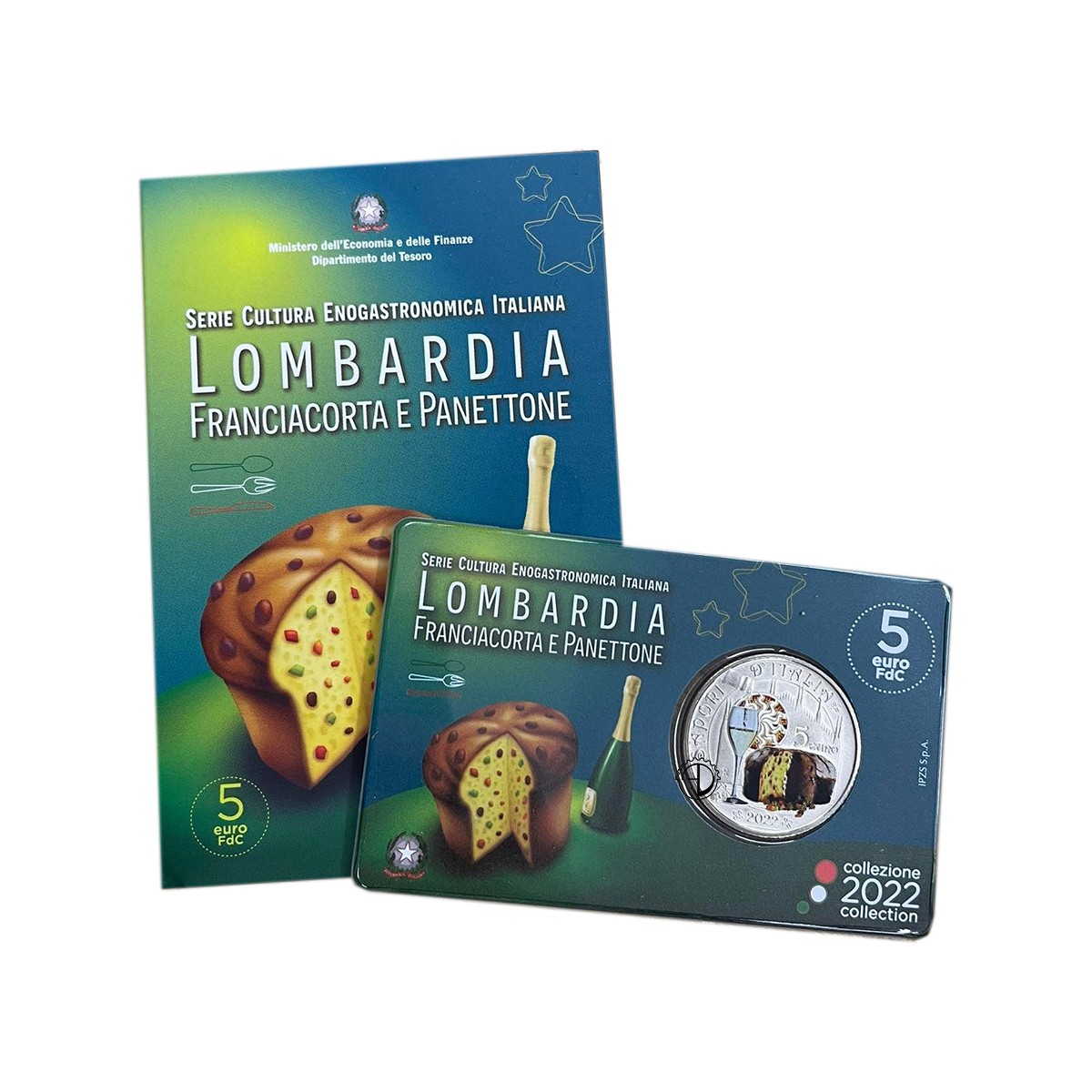 Raffigurazione di un panettone e di un calice in cui viene versato il vino spumante tipico della zona Franciacorta; in secondo piano, un profilo del Duomo di Milano su cui si evidenzia un particolare del rosone gotico con il simbolo araldico visconteo denominato la “Raza”, posto nella vetrata centrale dell’abside del Duomo. In alto, ad arco, la scritta “SAPORI D’ITALIA”; a destra, il valore “5 EURO”; a sinistra “R”, identificativo della Zecca di Roma; in esergo, “2022”, anno di emissione della moneta, delimitato ai lati da elementi decorativi rappresentativi della Rosa Camuna. Moneta con elementi colorati.