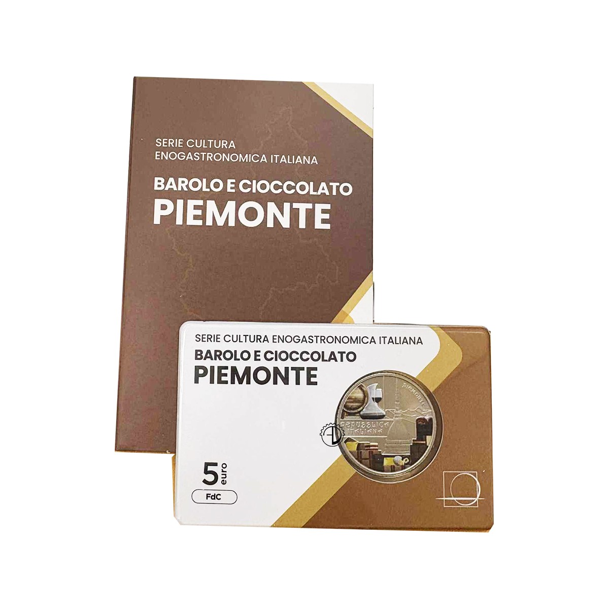 Dritto: In primo piano un paesaggio urbano creato con delle tavolette di diverse varietà di cioccolato ed alcuni dei cioccolatini tipici piemontesi quali i cri cri, il gianduiotto, il boero ed il cremino. Al centro, raffigurata la Mole Antonelliana, edificio simbolo di Torino; in alto a sinistra un decanter, un bicchiere ed una botte in legno pregiato rappresentano il vino Barolo eccellenza della regione. Nel campo, lo skyline della catena montuosa delle Alpi; a sinistra, la scritta “Repubblica Italiana” e “M.BONIFACIO”, firma dell’autore; in alto a destra, ad arco la scritta “Piemonte”. Moneta con elementi colorati.