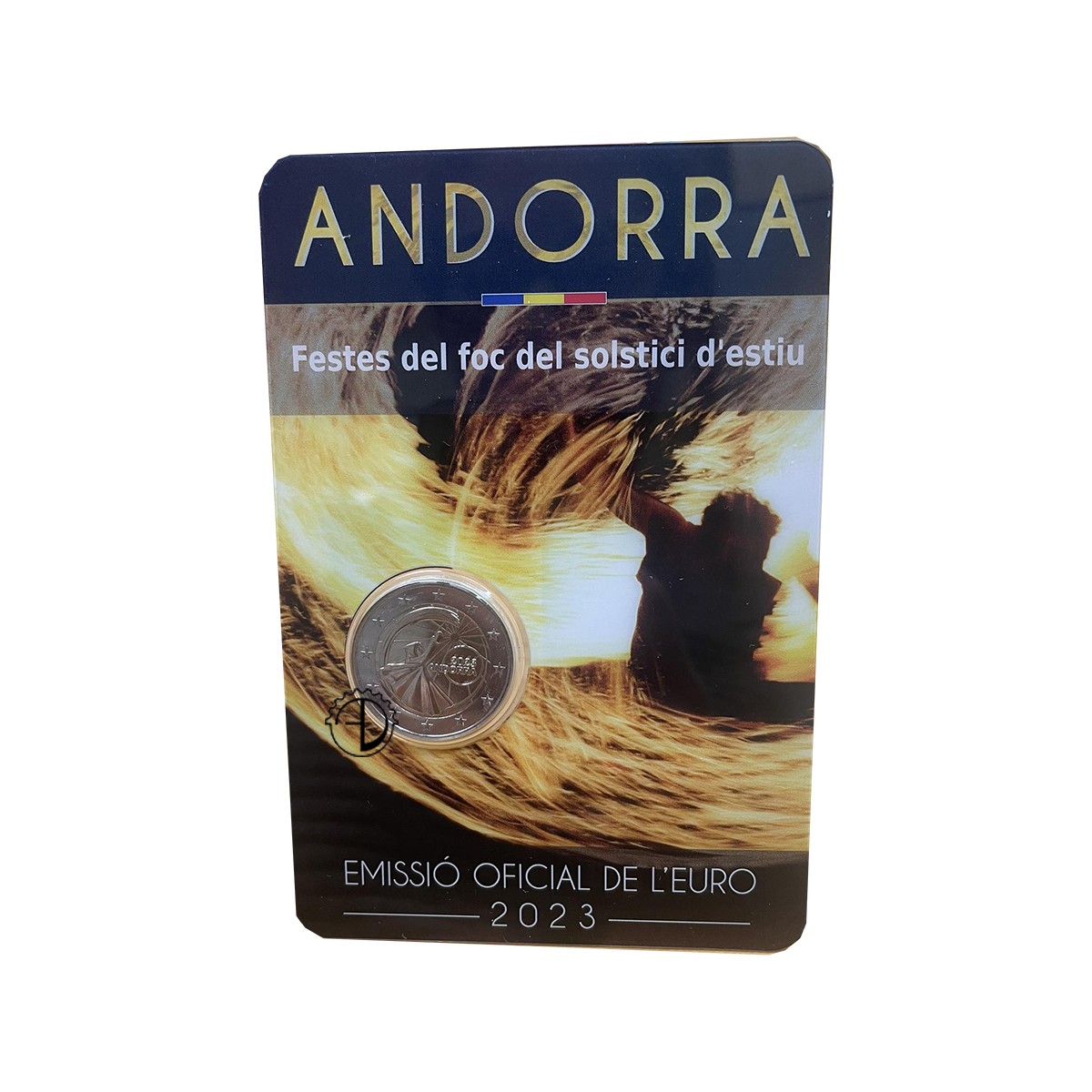 Sullo sfondo è raffigurato il sole con i suoi raggi e sulla destra la scritta 2023 ANDORRA. Sulla sinistra è incisa invece una figura incappucciata col mantello in movimento che fa roteare col braccio destro una torcia infuocata. Il movimento della torcia crea una scia infuocata a forma di semicerchio che parte da destra e termina in alto a sinistra.