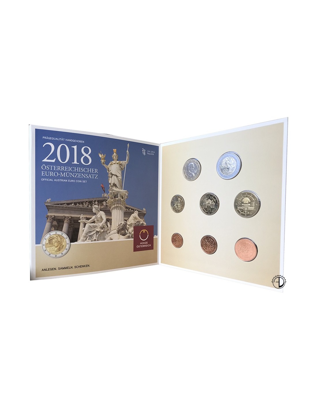Il folder contiene le monete da 1cent a 1 euro austriache standard e la moneta da 2 euro commemorativa 2018 dedicata al “100° anniversario della Repubblica Austriaca”.