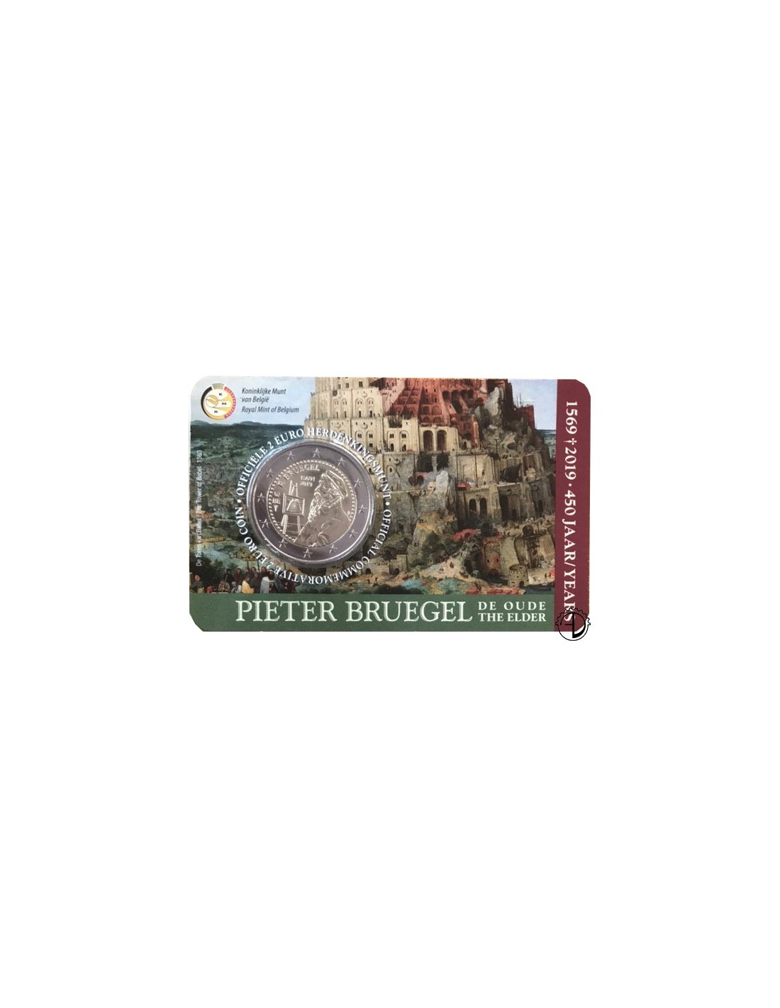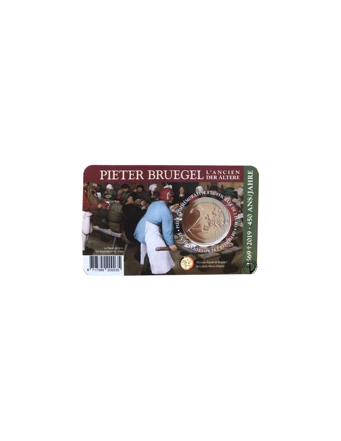 Nel tondo interno è raffigurato il ritratto del famoso artista belga Pieter Bruegel il Vecchio, insieme a un dipinto su un cavalletto. Al di sopra di questo sono riportati il nome di P. Bruegel, l’anno 1569, con un sottile obelisco che fa riferimento all’anno del decesso, e l’anno 2019, l’anno di emissione. Poiché sarà la zecca reale dei Paesi Bassi a coniare le monete, sul lato sinistro figurano il caduceo, segno della zecca di Utrecht, lo stemma del comune di Herzele, segno del direttore della zecca del Belgio, e la sigla del paese BE. Sulla destra sono riportate le iniziali L.L., che rimandano al disegnatore della moneta, Luc Luycx. Infine, lungo il bordo del tondo interno dei puntini formano un cerchio.
