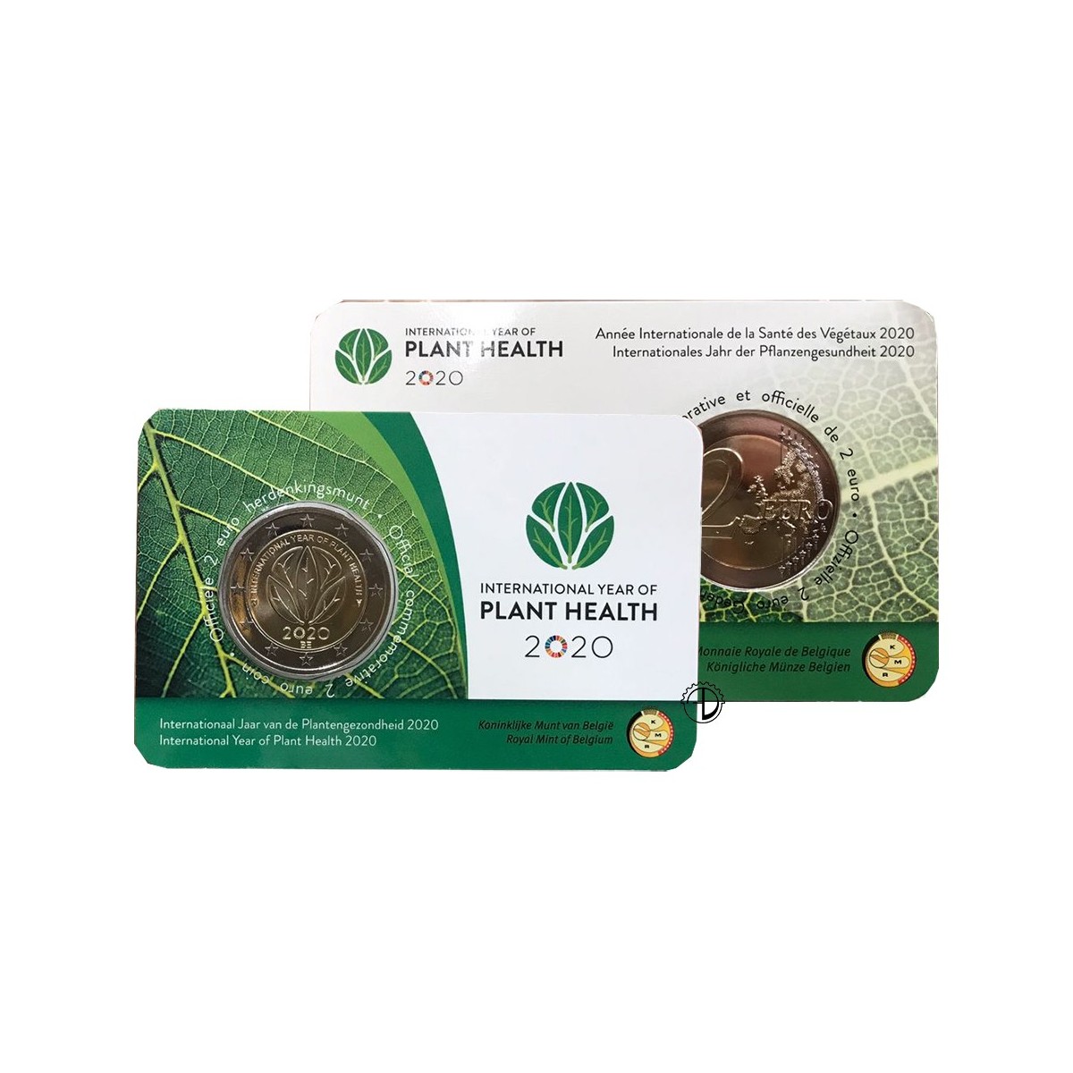 Nel tondo interno figurano il logo ufficiale dell’anno internazionale della salute delle piante 2020, che rappresenta simbolicamente delle foglie, e il testo «International year of plant health». Le foglie rappresentano piante in salute in quanto origine dell’ossigeno che respiriamo, del cibo che consumiamo e della vita sulla Terra. Questa immagine positiva delle foglie protette da parassiti e malattie mortali forma un cerchio che rappresenta il mondo e sottolinea che la salute e la protezione delle piante sono una questione mondiale. La salute delle piante è cruciale per eliminare la fame, ridurre la povertà, proteggere l’ambiente e promuovere lo sviluppo economico. Poiché sarà la zecca reale dei Paesi Bassi a coniare le monete, a destra figura il caduceo, marchio della zecca di Utrecht. Il marchio del direttore della zecca del Belgio e lo stemma del comune di Herzele figurano sulla sinistra. Nella parte inferiore sono incisi la sigla del paese «BE» e l’anno di emissione «2020».p>