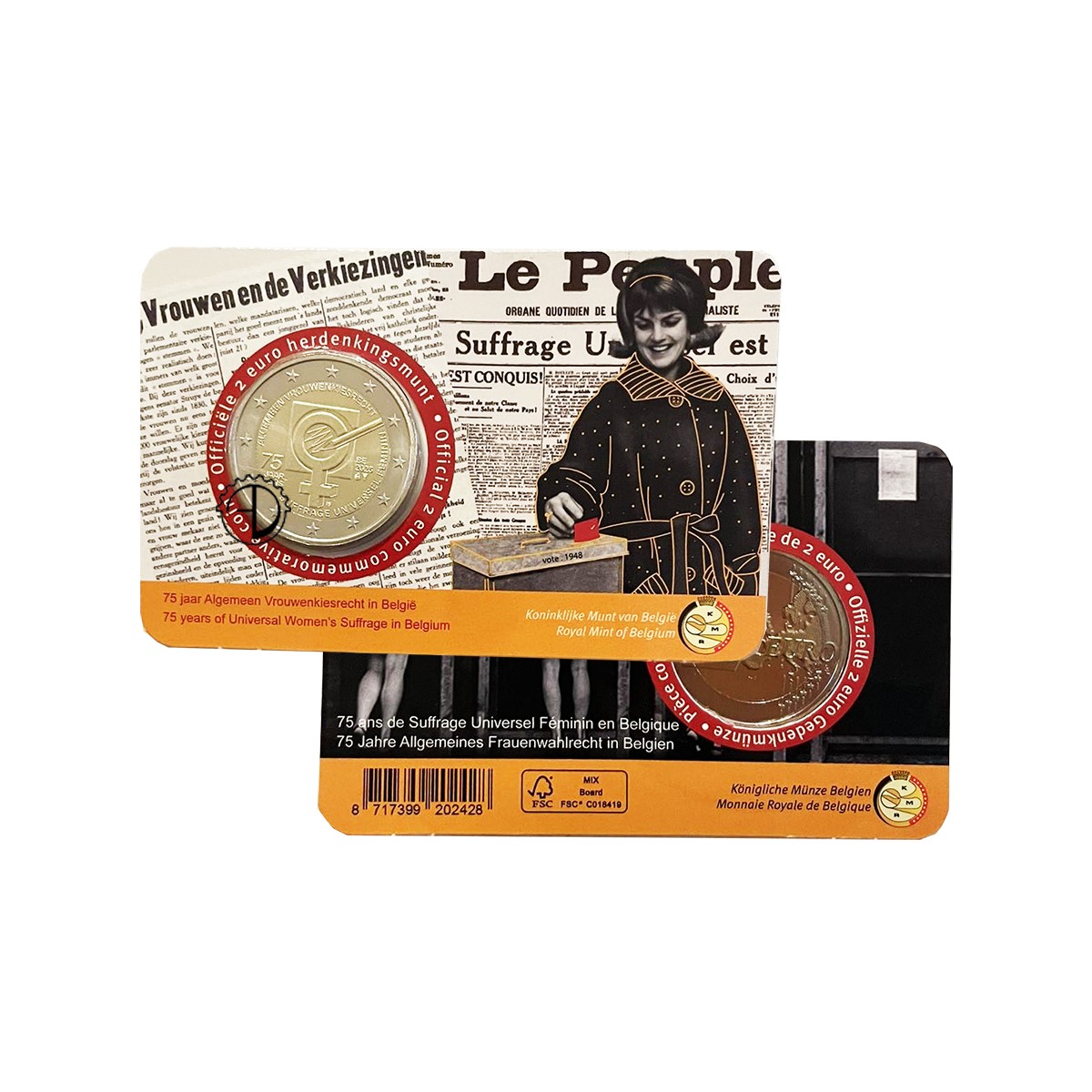 In alto ad arco la scritta "ALGEMEEN VROUWENSTEEMRECHT"; in basso ad arco la scritta "SUFFRAGE UNIVERSEL FÉMININ" e le iniziali dell'autrice Iris Bruijns "IB"; al centro il simbolo di genere femminile (simbolo di Venere) sovrapposto ad una scheda elettorale con una matita; a sinistra la scritta "75 JAAR ANS"; a destra il segno “BE", che identifica il Belgio, l'anno di emissione "2023", un fiore di aster davanti a una fiaschetta di Erlenmeyer, segno del direttore di zecca del Belgio Giovanni Van de Velde, e il caduceo, simbolo della zecca olandese. Sul bordo esterno 12 stelle a cinque punte rappresentanti l'Unione Europea.