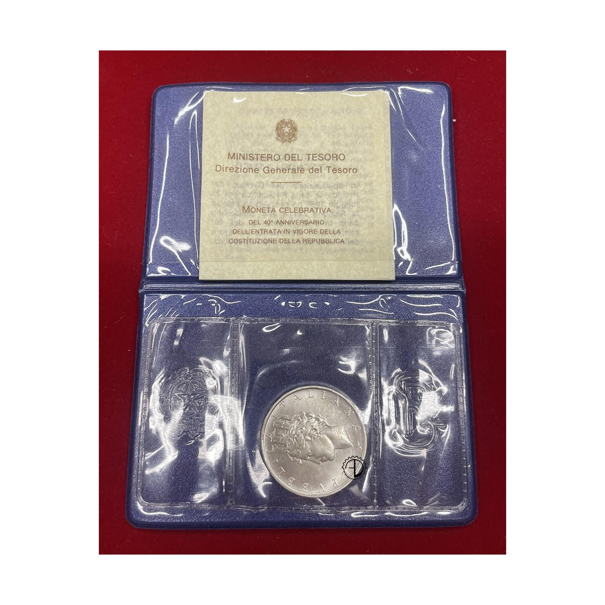 Questa moneta è stata coniata per commemorare il 40° anniversario della Costituzione della Repubblica Italiana.