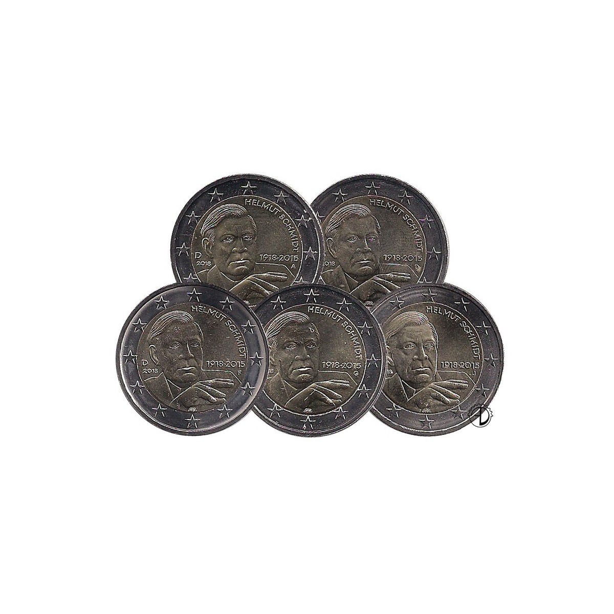 Il disegno raffigura Helmut Schmidt in una posa caratteristica, impegnato nel dialogo con il suo interlocutore. In alto a destra, in semicerchio, l’iscrizione «HELMUT SCHMIDT» e sul lato destro gli anni «1918-2015». L’identificativo della relativa zecca figura sotto gli anni. Sulla sinistra è riportato il codice del paese di emissione «D», al di sotto del quale è indicato l’anno di emissione «2018». In basso sono riportate le iniziali dell’artista.