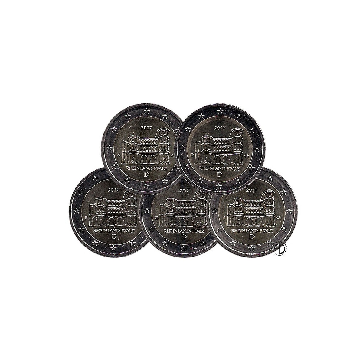 Il disegno raffigura la Porta Nigra di Treviri, che è probabilmente la porta cittadina romana meglio conservata a nord delle Alpi. Nella parte interna figurano anche il nome «RHEINLAND-PFALZ» e, in basso, il codice del paese di emissione «D». A sinistra figura il marchio della zecca («A», «D», «F», «G» o «J») mentre l’anno «2017» figura nella parte superiore. A destra sono riportate le iniziali del disegnatore «CH» (Chocola Frantisek).