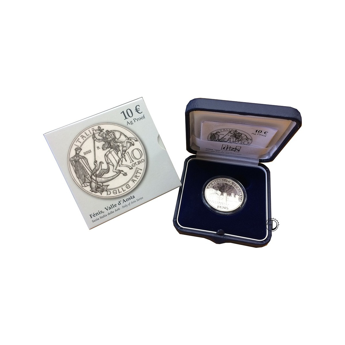 Sul rovescio: Affresco con San Giorgio e il drago, posto sullo sfondo dello scalone del cortile interno del Castello di Fenis (Valle d’Aosta); nel giro ITALIA / DELLE ARTI; nel campo, 2013 – R; in basso a destra 10 / EURO.
