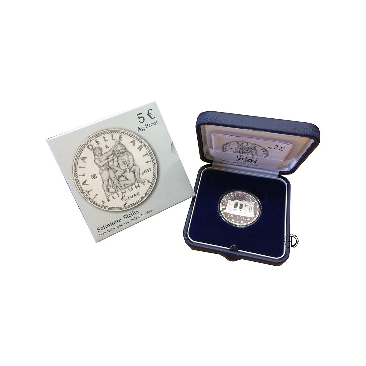 Sul rovescio: Particolare di una metopa del tempio C di Selinunte, con il mito di Perseo e la Medusa del VI secolo a.C., (Palermo, Museo Archeologico Regionale); in alto, R; nel giro ITALIA DELLE ARTI; nel campo di sinistra, particolare dal rovescio di moneta incusa; nel campo di destra 2013; in esergo, SELINUNTE / 5 EURO; intorno, cerchio di perline.