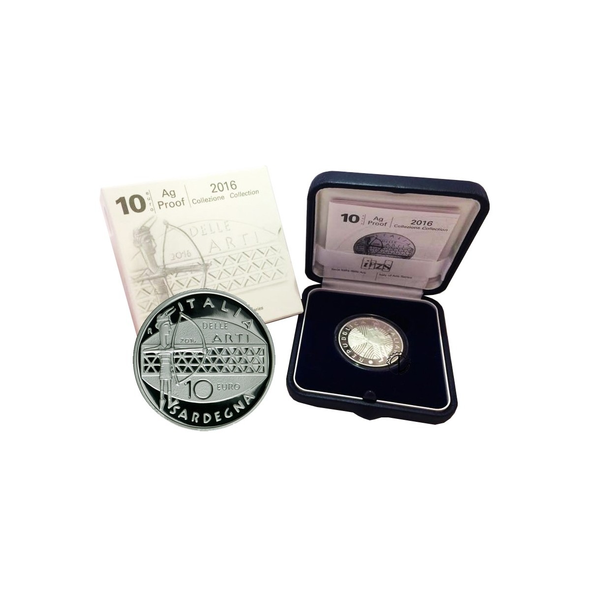 Rovescio: statuetta sarda in bronzo di arciere (Cagliari, Museo Archeologico Nazionale); in secondo piano, entro forma geometrica, transenna di navicella nuragica in bronzo; nel campo, in alto, su tre righe, "ITALIA" / "DELLE" / "ARTI"; a sinistra, "R"; nel campo, "2016"; in basso, su due righe, "10 EURO" e "SARDEGNA".