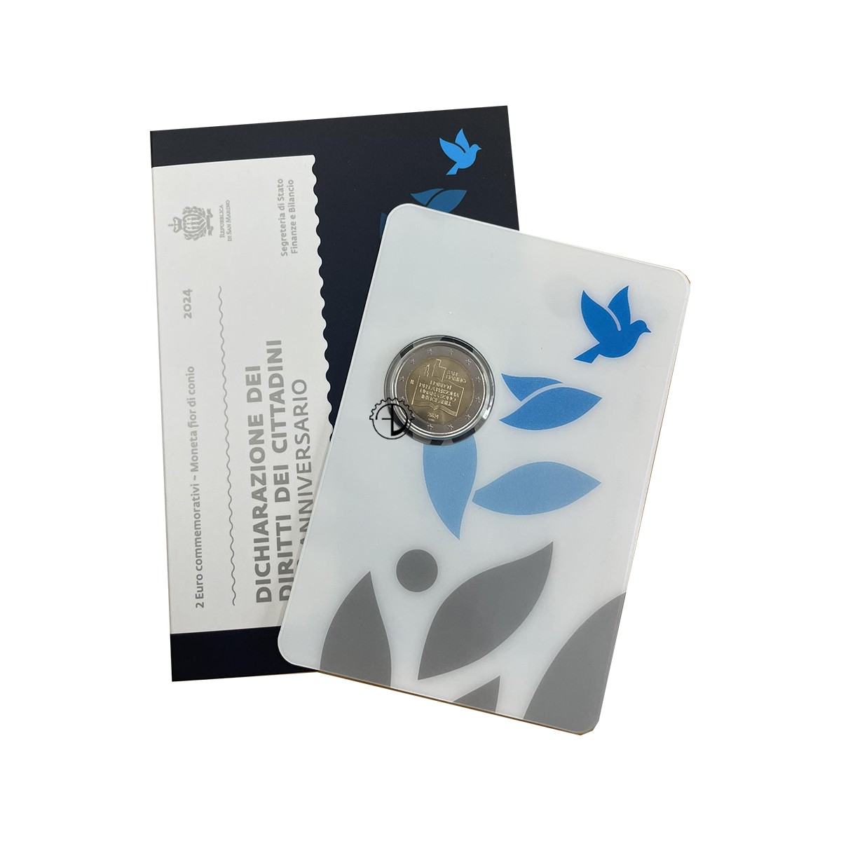 Al centro del dritto della moneta è raffigurato un libro aperto che riporta la scritta “I DIRITTI DELLA PERSONA UMANA SONO INVIOLABILI”, frase tratta dall’articolo 5 della Legge 8 luglio 1974 n.59. Completano la moneta le silhouette della Statua della Libertà e del Palazzo Pubblico e la scritta SAN MARINO, a sinistra la lettera R, identificativo della Zecca di Roma, in basso al centro l’anno 2024 e le iniziali dell’incisore Emanuele Ferretti, E.F. INC.