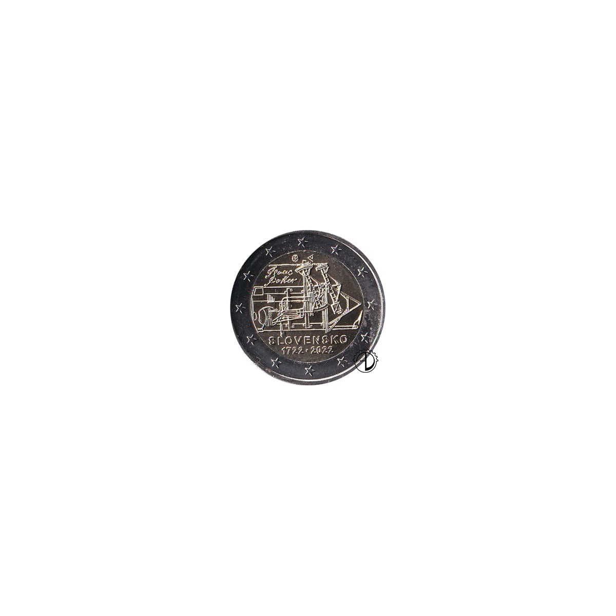 il disegno raffigura una macchina a vapore atmosferica per il drenaggio di acqua dalle miniere costruita nel 1722 nella città mineraria di Nová Baňa - la prima del suo genere nell'Europa continentale. La macchina fu progettata e costruita dall'ingegnere inglese Isaac Potter, la cui firma è riprodotta, su due linee, sul lato inferiore sinistro del disegno. Sul lato destro della macchina sono riportati in verticale il nome del paese di emissione «SLOVENSKO» e a destra del nome, separati da un punto mediano, gli anni «1722» e «2022». Vicino all'estremità sinistra del cerchio interno della moneta figurano il marchio della zecca di Kremnica («Mincovňa Kremnica»), costituito dalle lettere «MK» poste tra due conii, e sotto il marchio le iniziali stilizzate di Peter Valach, il disegnatore della faccia nazionale.