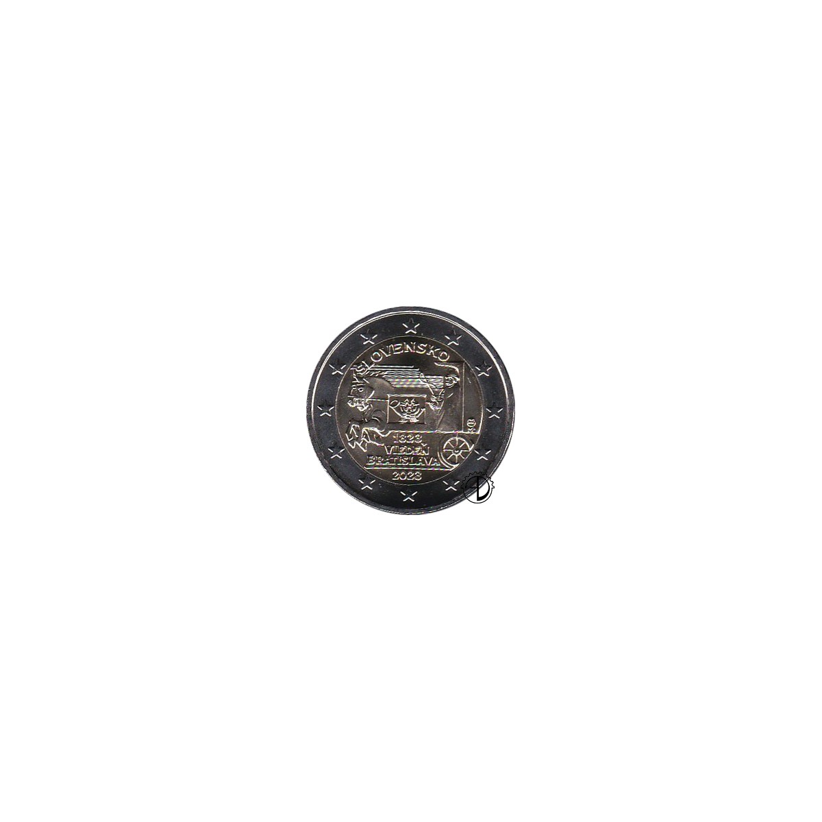 La rappresentazione simbolica del servizio di corriere espresso tra Vienna e Bratislava presenta una carrozza trainata da cavalli in rapido movimento con, al centro, un inserto rettangolare contenente un corno postale. Sotto l'immagine figura l'anno «1823», data di inizio del servizio di corriere espresso, e sotto la data sono riportati, in slovacco e sovrapposti, i nomi delle due città: «VIEDEŇ» e «BRATISLAVA». Nella parte inferiore del cerchio interno della moneta figura l'anno di emissione «2023», separato con una linea orizzontale dal testo sopracitato. Il nome del paese di emissione «SLOVENSKO» è riportato lungo il bordo superiore del disegno. A destra della carrozza figura il marchio della zecca di Kremnica (Mincovňa Kremnica), costituito dalle lettere «MK» poste tra due conii. Al di sotto del marchio figurano le iniziali stilizzate «MP» della disegnatrice della faccia nazionale, Mária Poldaufová.