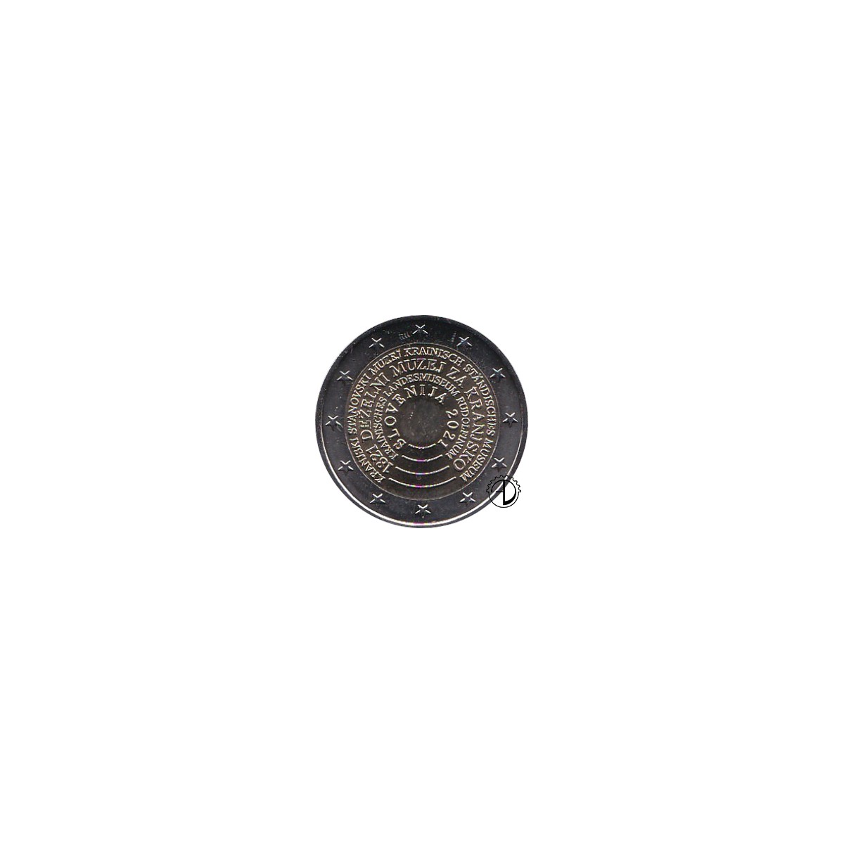 il disegno si ispira alle cinture raffigurate sulla Vače Situla – uno dei più belli artefatti di situla – un simbolo grafico delle stratificazioni storiche che il museo conserva per le generazioni future. Il disegno raffigura graficamente e con nomi differenti le fasi del museo nel corso della sua storia bicentenaria. I nomi sono visualizzati con le stesse modalità delle cinture sulla Vače Situla. Sulla moneta è riportato il nome del paese «SLOVENIJA» e l’anno di emissione «2021». Sull’anello esterno della moneta figurano le 12 stelle della bandiera dell’Unione europea.