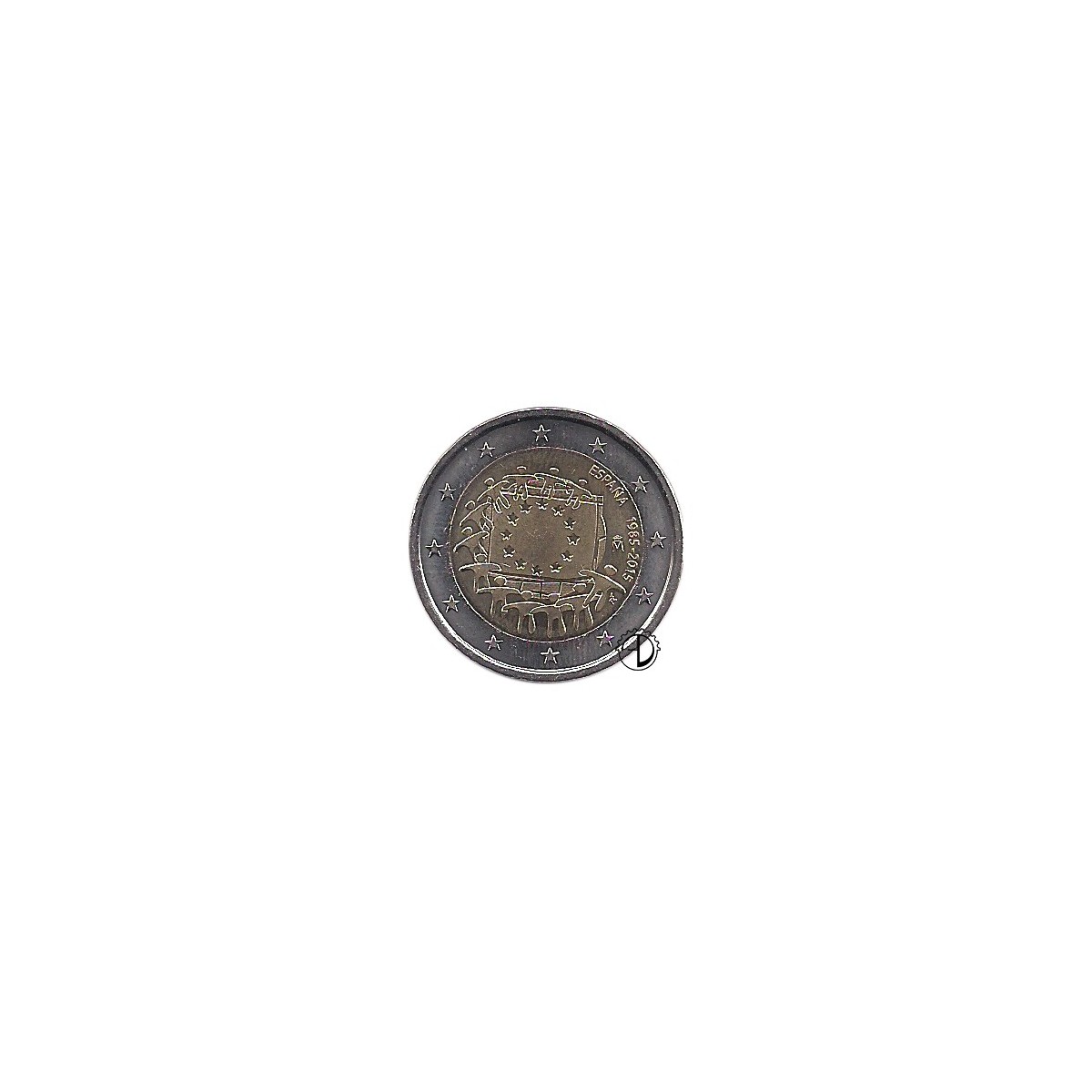 Per celebrare il trentennale della bandiera dell'UE, i ministri delle Finanze dell'area dell'euro hanno deciso che gli Stati membri dell'area dell'euro avrebbero coniato una moneta commemorativa da 2 euro con un disegno comune sulla faccia nazionale. I cittadini e i residenti dell'area dell'euro hanno selezionato il disegno vincitore con un voto pubblico su internet. Ai votanti è stato proposto di scegliere fra cinque disegni, preselezionati da una giuria professionale a seguito di una gara di disegno fra le zecche europee. Il disegno prescelto è stato quello creato da Georgios Stamatopoulos, incisore professionista presso la Banca di Grecia.